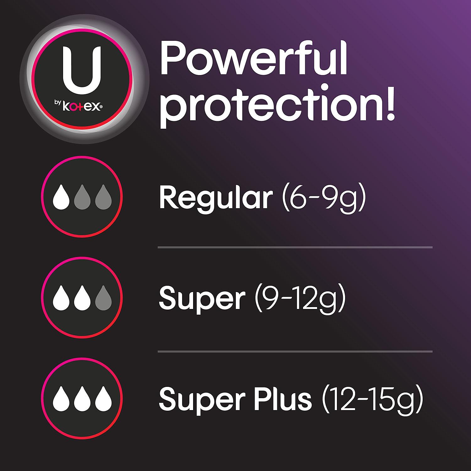 Pull the lower half of the tampon until you hear it lock and then insert. Click Tampons are designed with a smooth tip for comfortable, quick and easy insertion. The tampon expands so you’re fully covered to help stop leaks. These super absorbency unscented tampons absorb 9-12 grams of fluid and are also available in Regular and Super Plus absorbencies. Need additional coverage? Use U by Kotex Barely There Liners for backup protection.