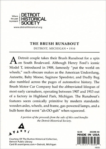 Made in the USA. A portion of the proceeds will benefit the Detroit Historical Society. The Brush Runabout, Detroit, Michigan, 1910