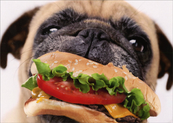 Dog Eats Cheeseburger Funny Pug Birthday Card