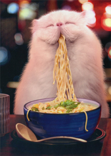 Cat Eating Steamy Noodles Funny Birthday Card