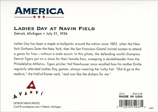 Printed in the USA on textured card stock. Matte finish. Ladies Day at Navin Field, Detroit, Michigan, July 21, 1936
