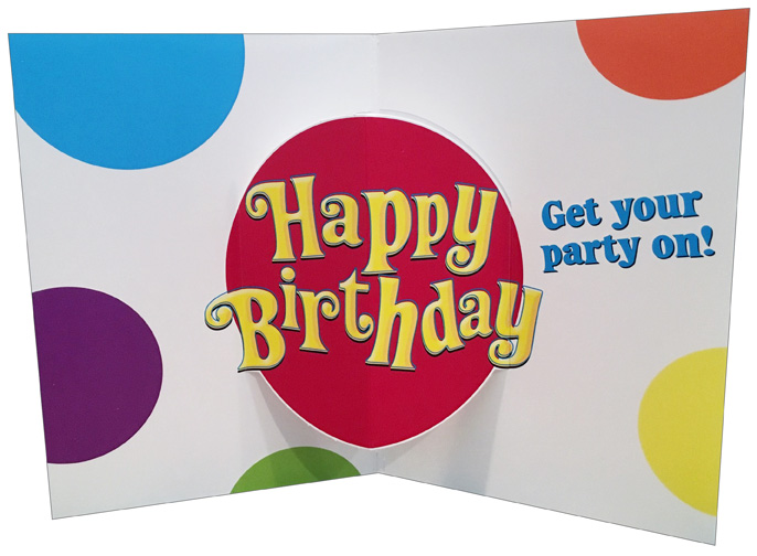 When this birthday card is opened, a die cut polka dot 'pops up' from the inside. Printed on FSC certified recycled paper. Made in the USA.