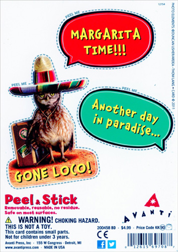 Decorate your world with Avanti attitude! Characters on the front and attitude statements on the back peel away and provide extra fun for the recipient. Includes a large sticker of an owl with a sombrero and luggage on the front and three stickers on the back of the card including a smaller version of the owl and two talk bubbles. Made in the USA. Removeable, reusable, no residue stickers. Safe on most surfaces.
