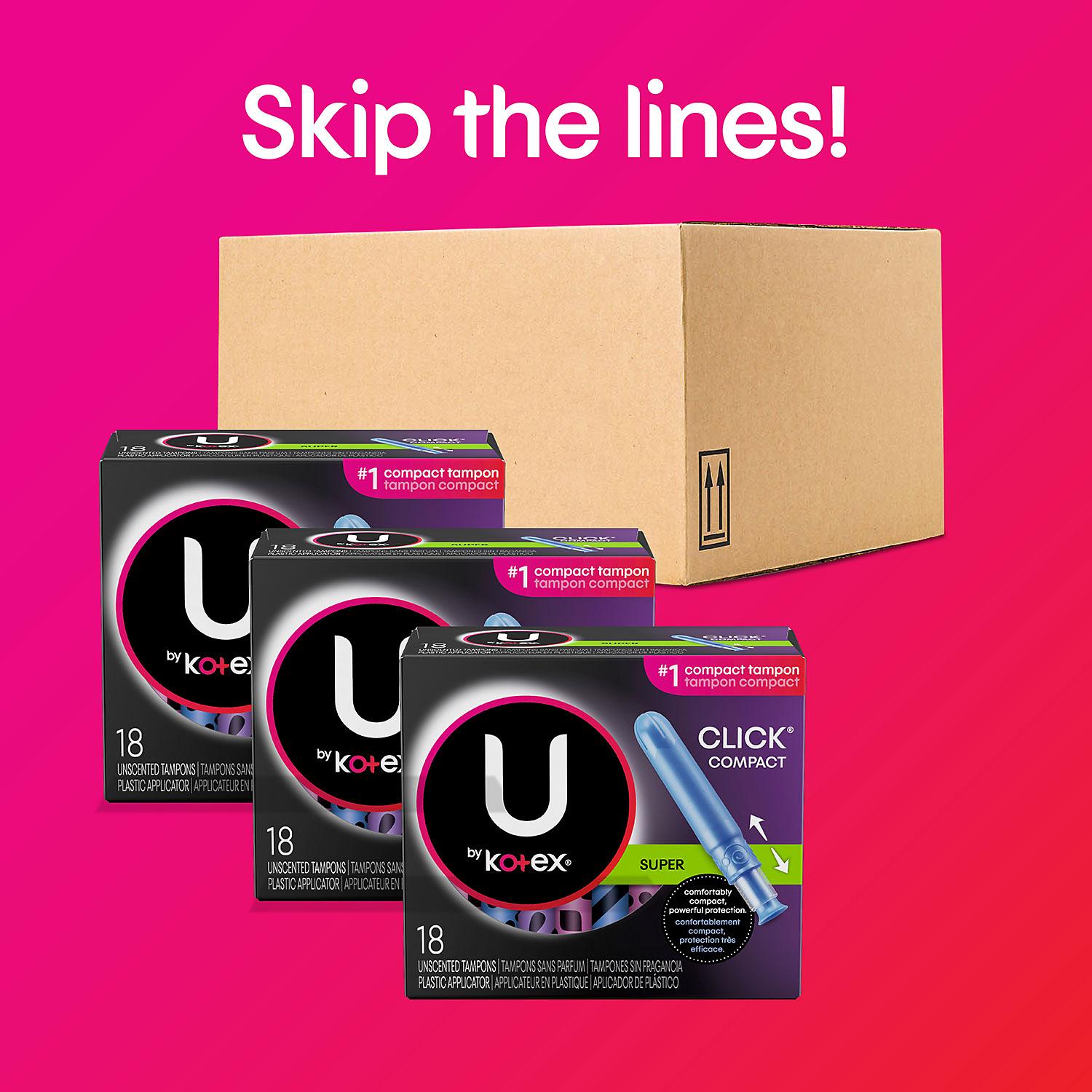 Get full-sized period protection with a comfortable compact tampon! U by Kotex Click Tampons allow you to discreetly carry period protection in your purse or pocket. Small in size but big on protection, these tampons go from compact to a full-size tampon in one easy step.