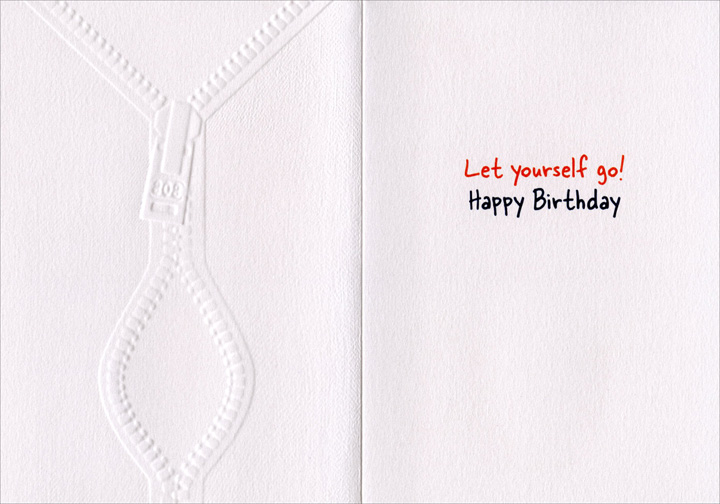 Embossing (raised up areas) in the gold foil zipper illustration gives a realistic look and feel to the front of this card. The textured cardstock creates an incredible look that actually feels like denim. Printed in USA.