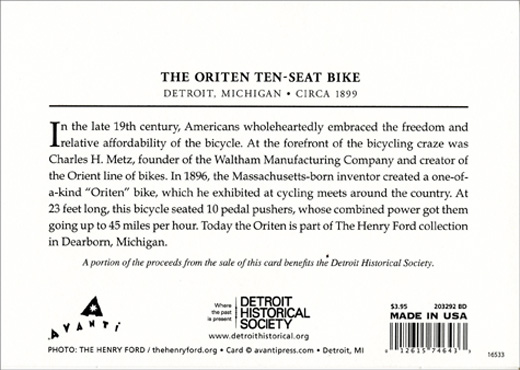 Made in the USA. A portion of the proceeds will benefit the Detroit Historical Society. The Oriten Ten-Seat Bike, Detroit, Michigan, Circa 1899
